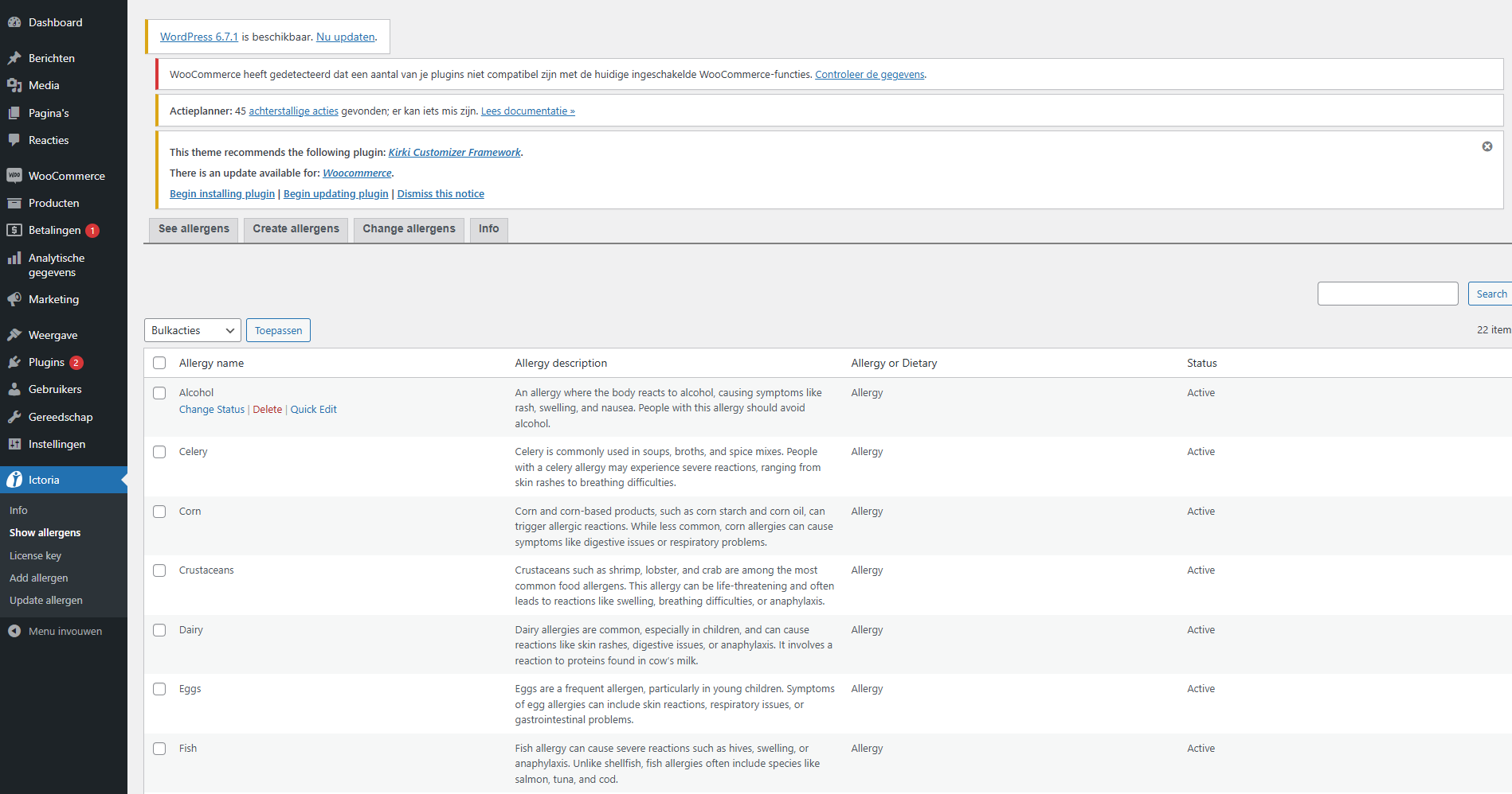 | 14-1-2025 | Project allergenen | Ik heb in het grootste deel van mijn stage bij het projectteam allergenen gewerkt. Dit is een plug-in en wordt gebruikt bij WooCommerce producten. Deze plug-in kan allergenen aan een product koppellen/ontkoppelen en je op de allergenen laten filteren. De allergenen die in de database zitten kun je bekijken op een tabel in de plug-in. Hier zie je ook een aantal standaard allergenen die je niet kunt verwijderen. De custom allergenen die je op een andere plek in de plug-in kan toevoegen kun je hier updaten (quick edit), verwijderen en koppellen/ontkoppelen. |